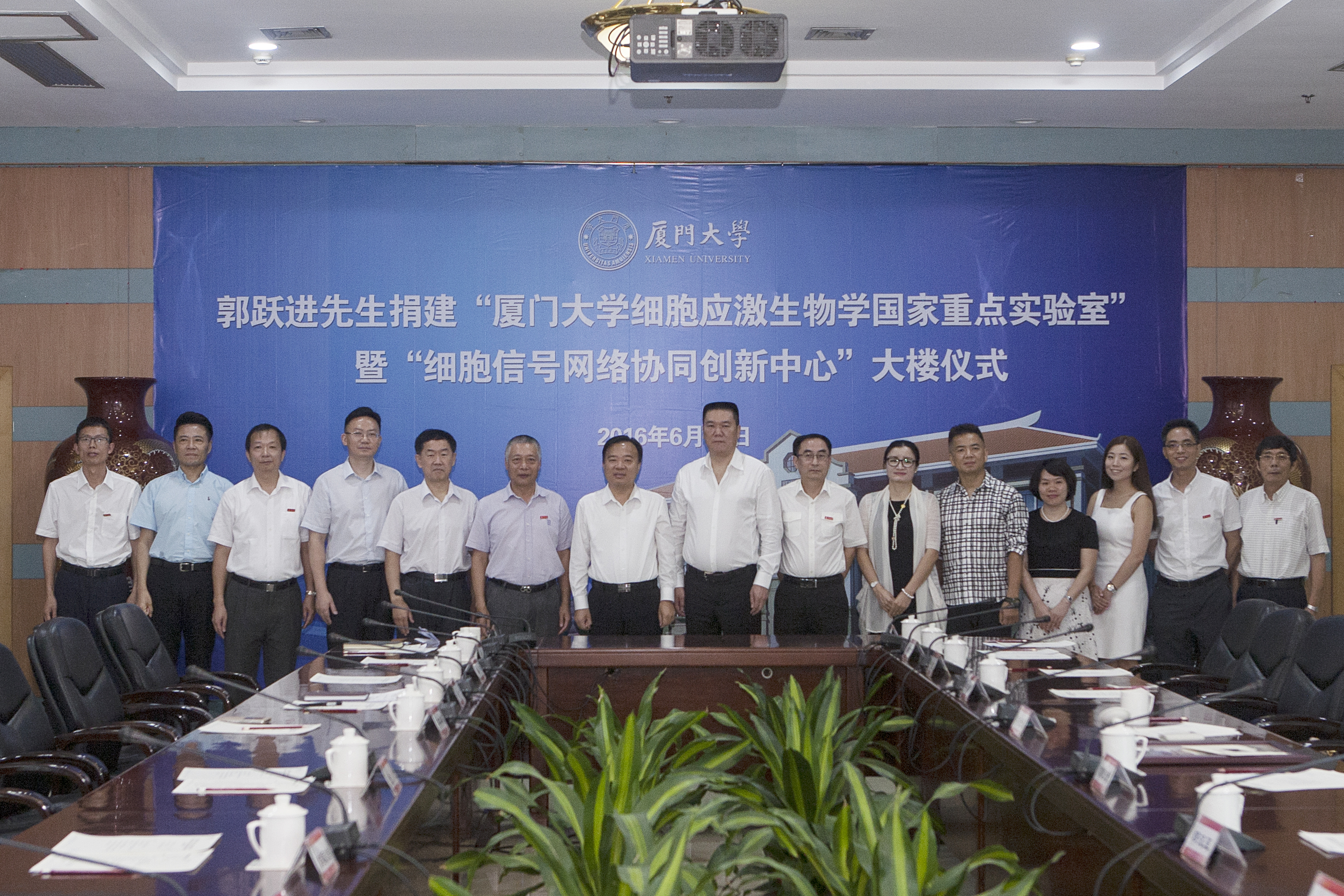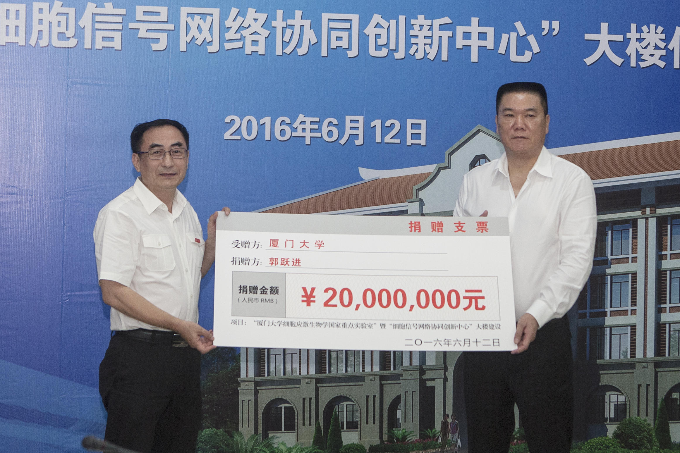 近日,厦门豪客来投资控股有限公司董事长郭跃进先生以个人名义捐资人民币2000万元,用于建设“厦门大学细胞应激生物学国家重点实验室”暨“细胞信号网络协同创新中心”大楼。6月12日上午,捐赠仪式在厦门大学颂恩楼举行。厦门大学党委书记张彦与郭跃进致辞。