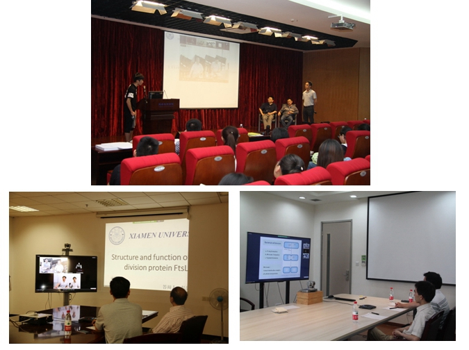 本次三校异地视频答辩活动由厦大生科院副院长周大旺教授主持,答辩的主会场设在厦大生科院五楼学术报告厅,同时设浙大和中科大两个分会场,参加答辩的导师分别为厦大生科院俞春东教授和叶军副教授、浙大生科院黄俊教授和陈军教授、中科大生科院吴缅教授、王均教授。